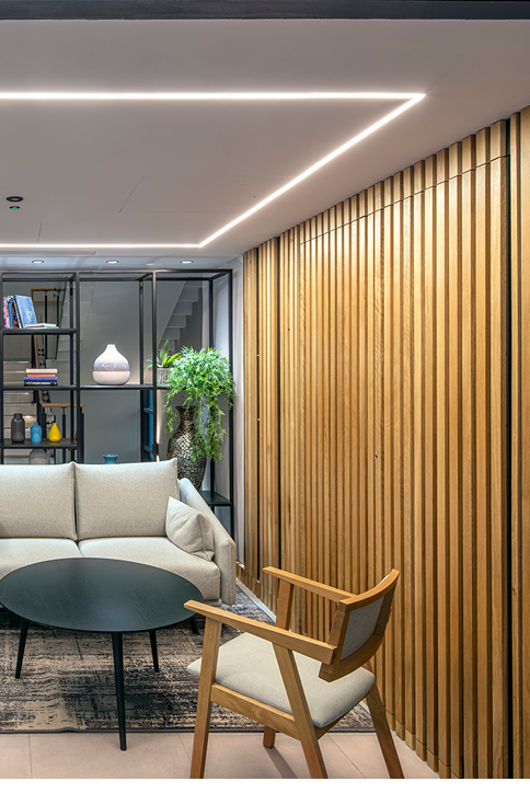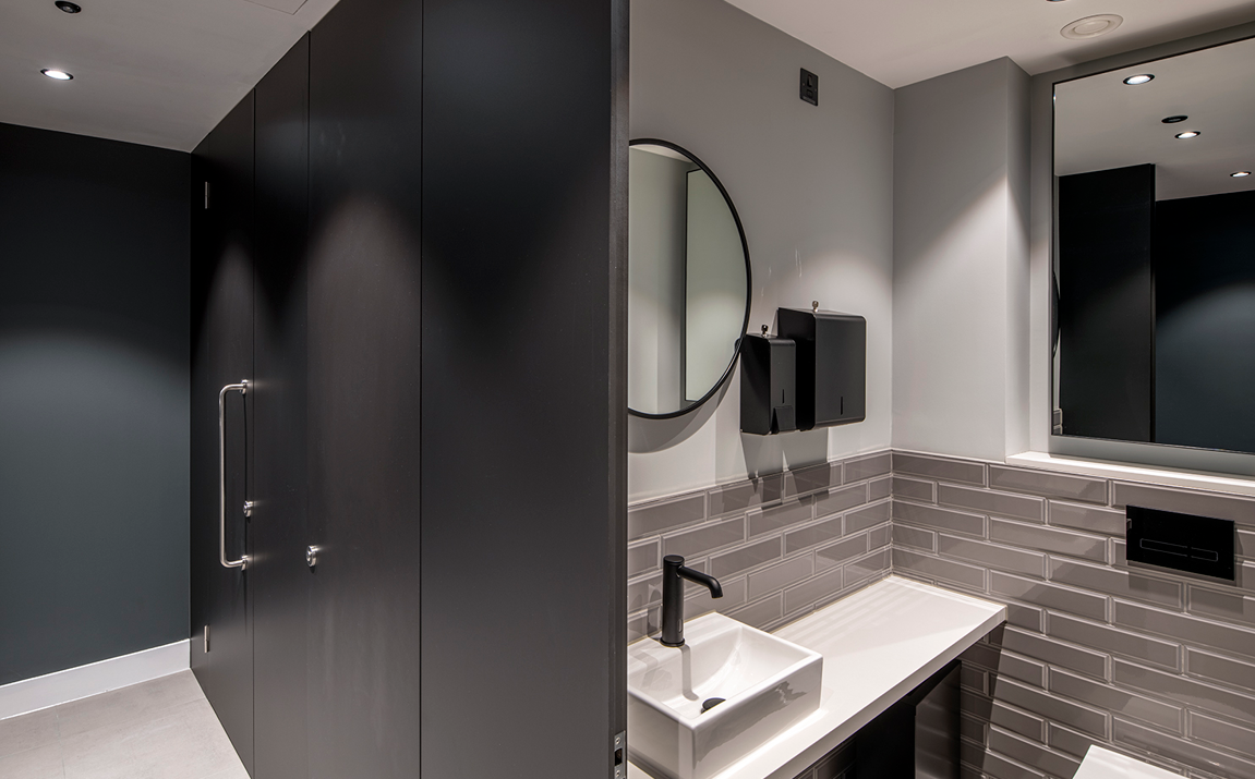 Levels 1 – 4 were stripped out to shell, and the front canopy was removed. The existing reception has been remodelled and refurbished, and the front entrance has been enhanced with a new canopy, ramps, and steps to the front of the building. High-quality brass lighting and fixtures complement the contemporary branding and feature lighting used for wayfinding and highlighting feature walls and panelling.