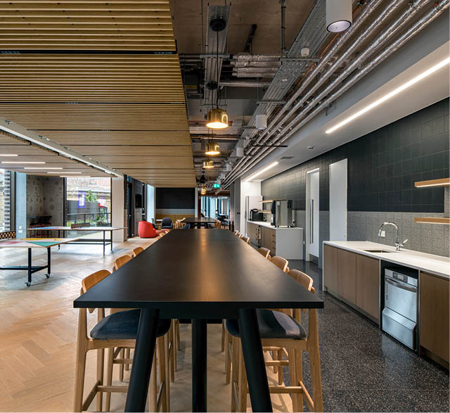 Exposed services, acoustic baffles, and slatted timber ceilings feature throughout. The state-of-the-art, practical partitioning by Optima Systems has a high acoustic rating and illuminates natural light across the entire floor.