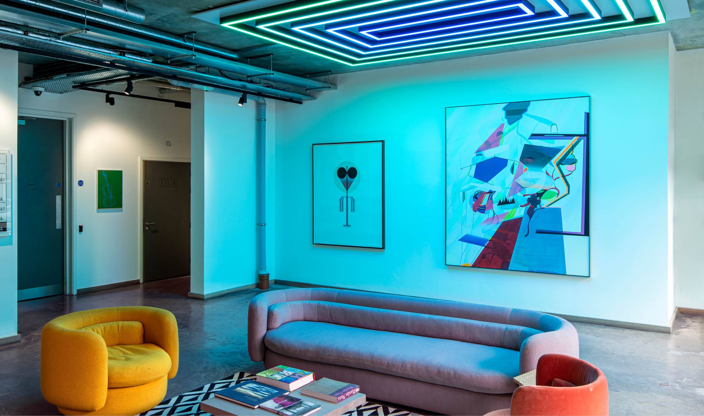 The interior scheme, inspired by the New York 'industrial urban chic' style of the 1930's, made features of the raw concrete structure and expansive ceiling heights with high spec exposed services. With a combination of specialist lighting, designed by Pritchard Themis and over 200 original pieces of art - including works by Martin Parr, Grayson Perry and Andy Warhol, The Arts Building has become a creative hub - attracting a diverse group of creatives and innovative businesses.