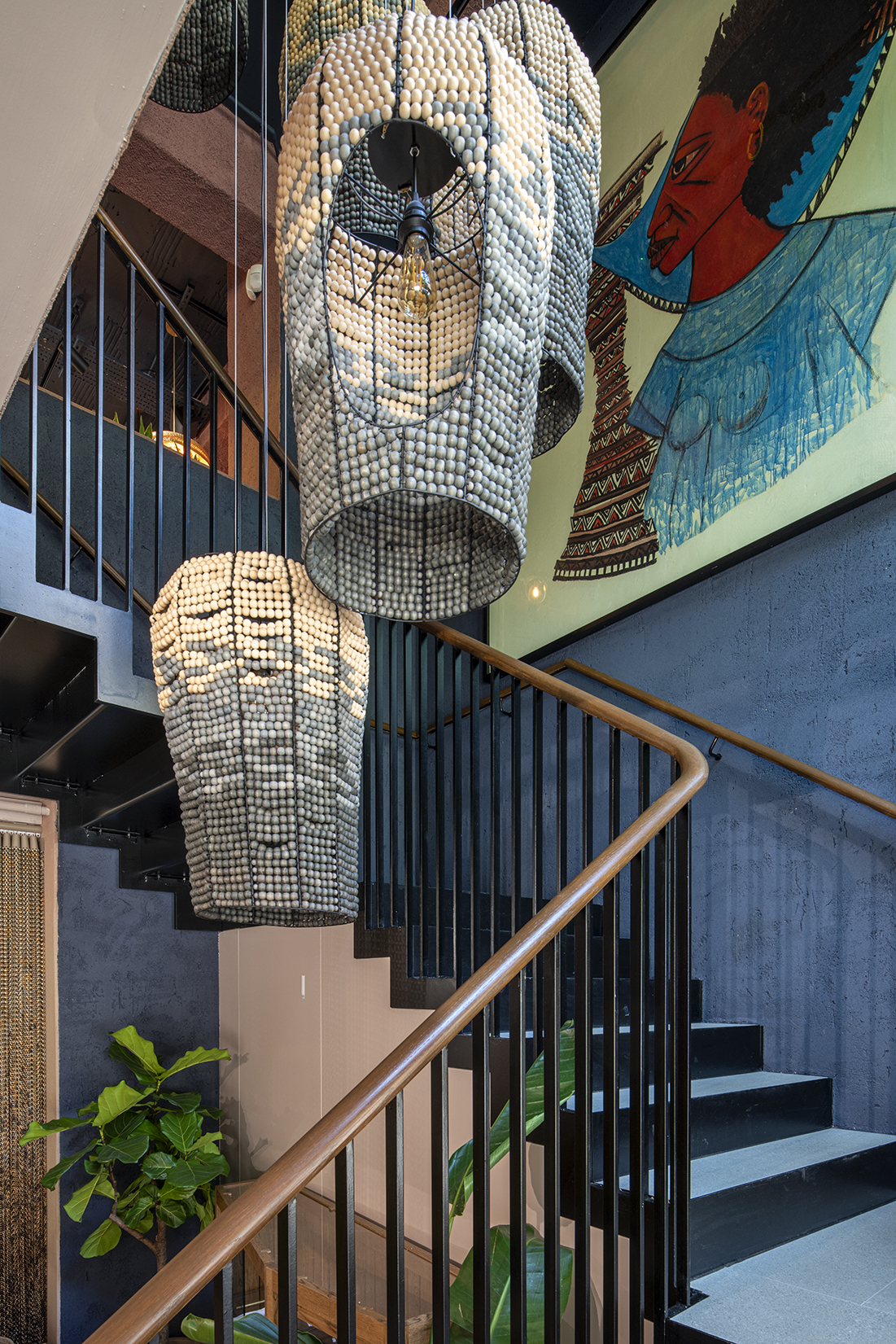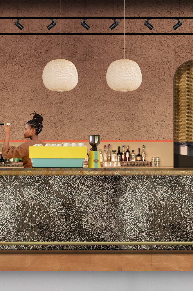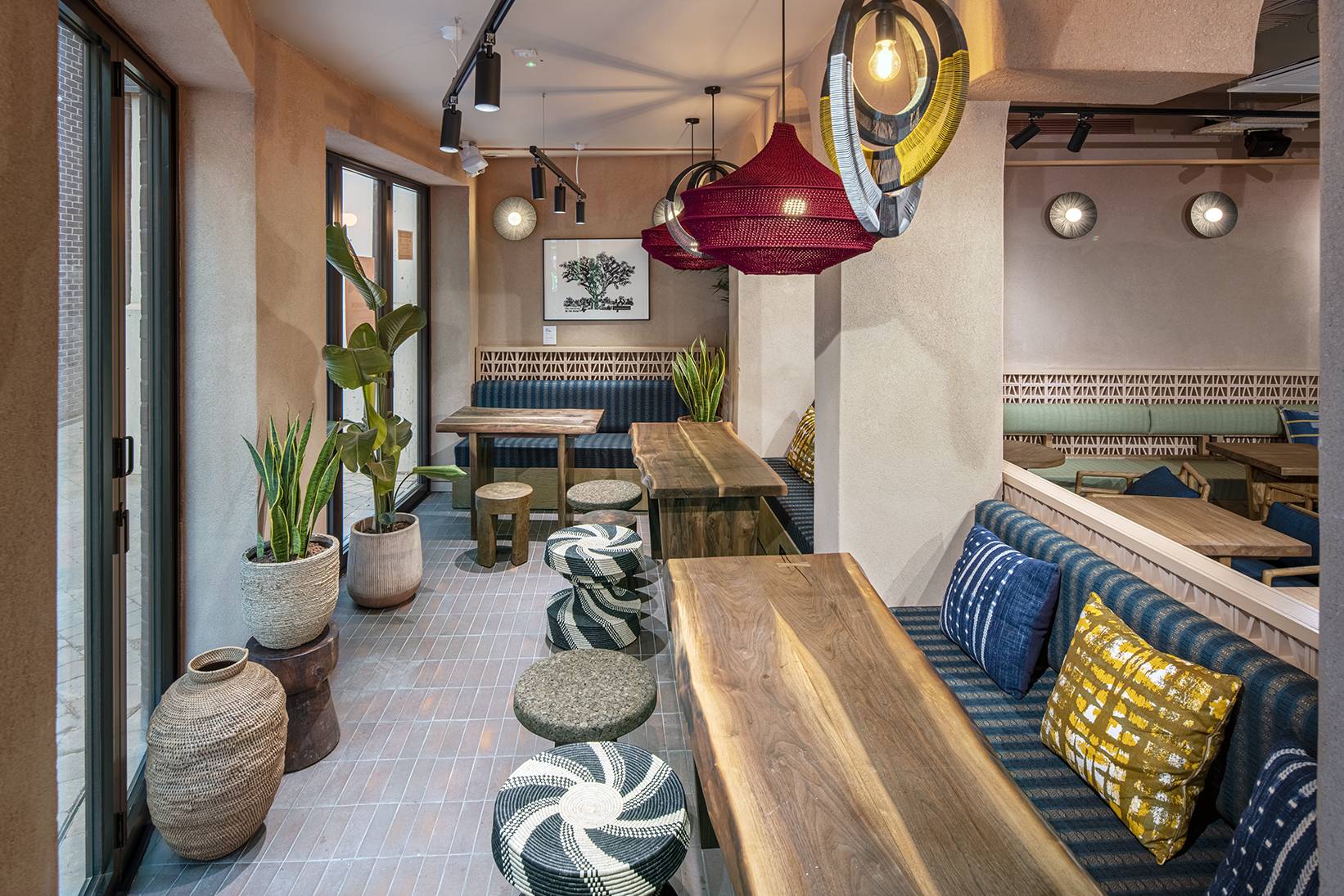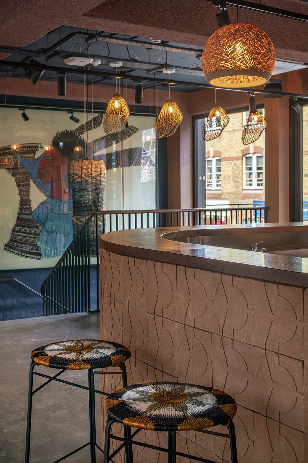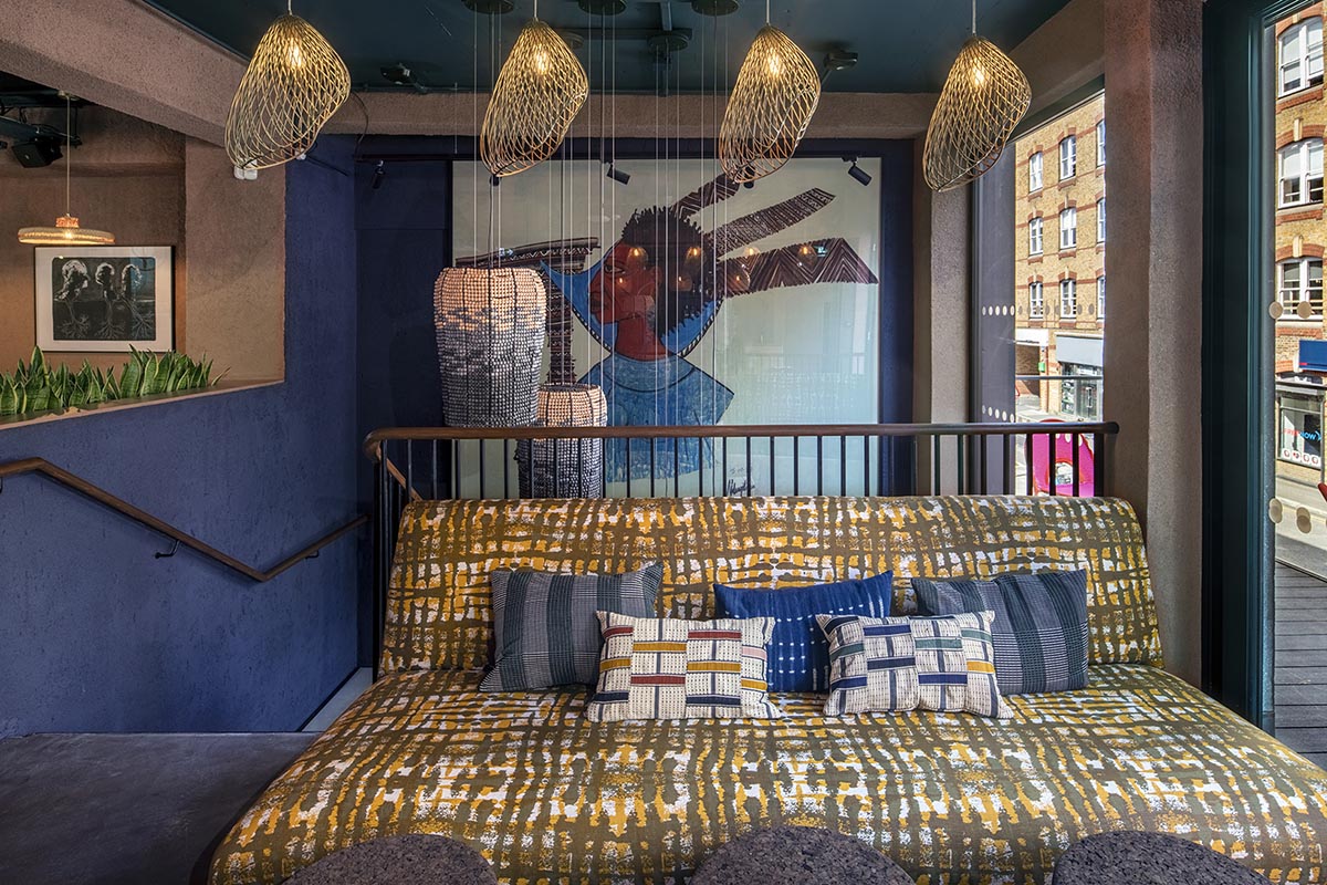 The design scheme embraced a vibrant palette representative of African roots while remaining contemporary. The use of natural clay plaster walls in deep earthy tones, bespoke joinery and the fittings and furniture, which were primarily sourced from African makers, bring this building to life.